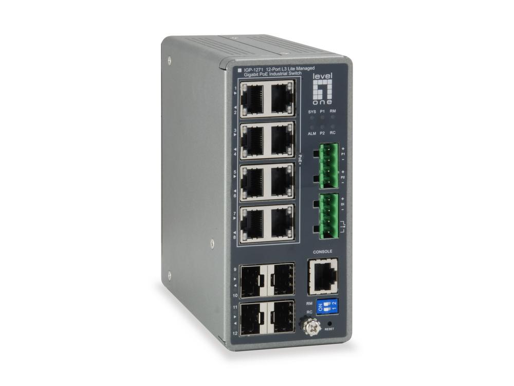 Der LevelOne IGP-1271, ein L3 Lite Managed PoE Industrial Switch mit 8 Gigabit RJ45 PoE+-Ports und 4 Gigabit SFP