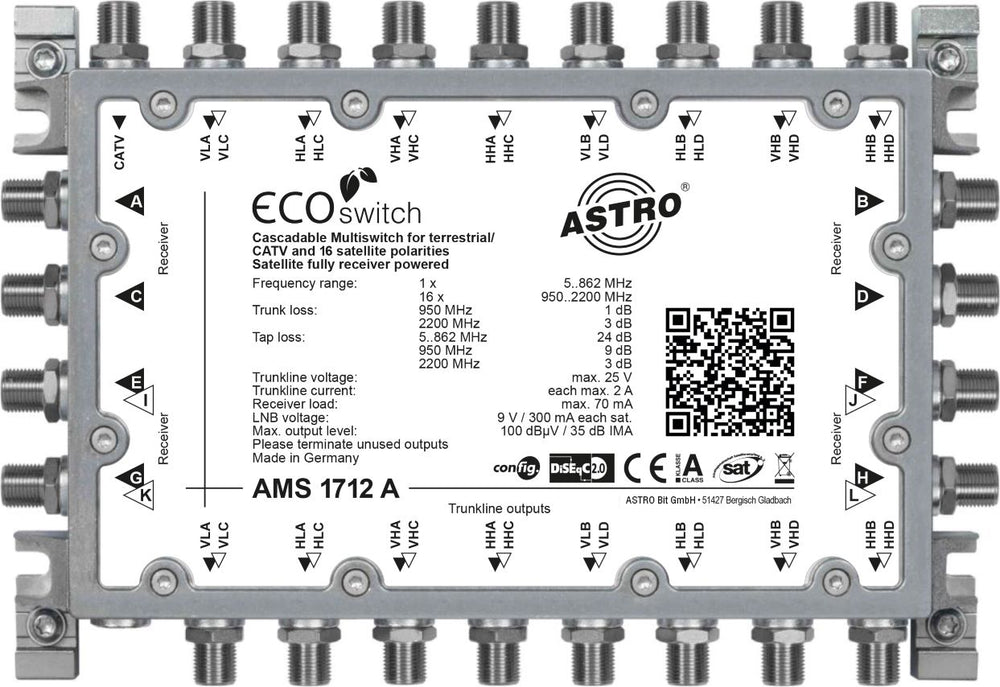Kaskadierbarer Multischalter für das AMS 17er Ecoswitch-System, 17 Eingänge für 4 Satellitenpositionen plus Terrestrik, 12 Teilnehmerausgänge
