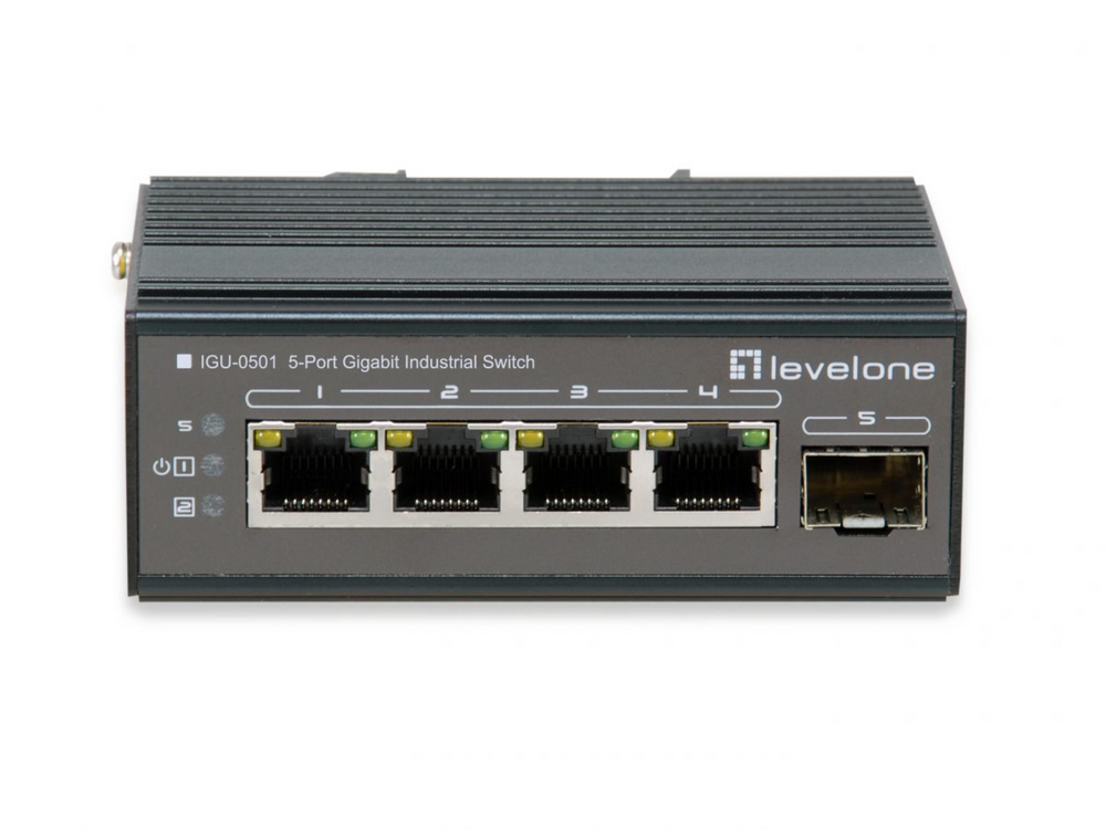 Der LevelOne IGU-0501 Industrie-Ethernet-Switch bietet 4 10/100/1000 Ports sowie einen Gigabit-SFP-Port, um ein