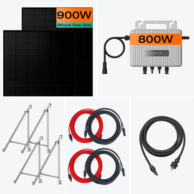 Im Lieferumfang enthalten sind zwei 5 m lange Solarkabel mit MC4-Steckern sowie ein 5 m Anschlusskabel mit Schukostecker für den direkten Netzanschluss. So kannst du sofort starten – ohne Vorkenntnisse und ohne Installateur.