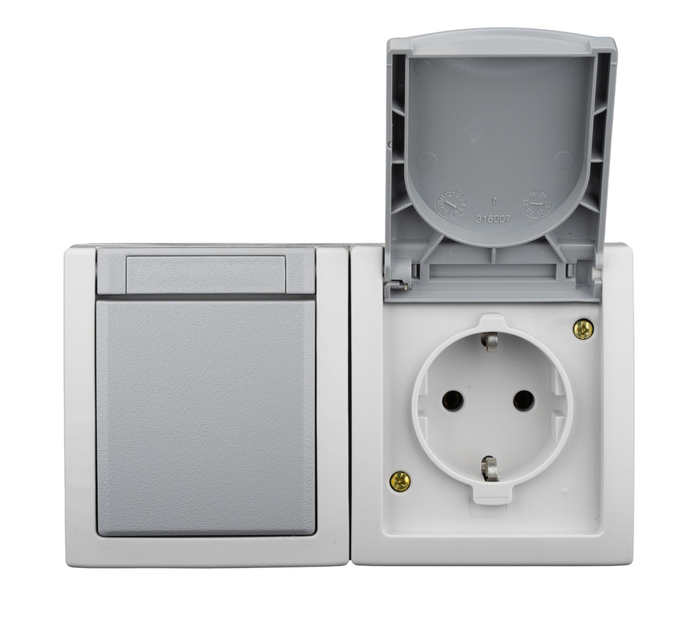 Robuste Aufputz-Schalter-Steckdosen Kombination aus langlebigem und witterungsbeständigem, glasfaserverstärktem Thermoplast-Kunststoff. Schalter und Steckdose sind IP54 Spritzwasser geschützt und bieten auch zusätzlichen Schutz gegen Staub. Weiters sind sie gegenüber Chemikalien und erhöhten Temperaturen resistent und besitzen gleichzeitig eine hohe Schlagfestigkeit (IK05). Innerhalb des Schalters befindet sich für den Erdungsanschluss bereits eine angeschlossene Schnellanschlussklemme, welche ein noch einfacheres Anschließen ermöglicht. Es können bis zu drei Kabeln durch die Dichtungsmembran durchgeführt werden sowohl oberhalb, als auch unterhalb des Schalters.