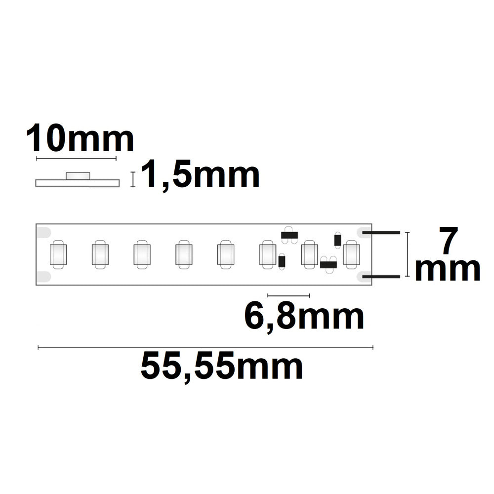 Trennstelle: 55,55mm mit je 8 SMD | Pitch (Lichtpunkt Mitte-Mitte): 6,94mm | 1 Einheit (Rolle) = 5m | max. Flexbandlänge pro Einspeisung: 5m | Längentoleranz + Wärmeausdehnung: 1% | erforderliche Kühlmasse min. 140 gr/m | inkl. 3M 9080A Klebeband | Untergrund vor dem Ankleben reinigen und entfetten! Nicht wieder ablösen! | Es passen die Verbinder der Gruppe: K1-210 / K2-210 | BESONDERHEIT: Anschlusskabel beidseitig