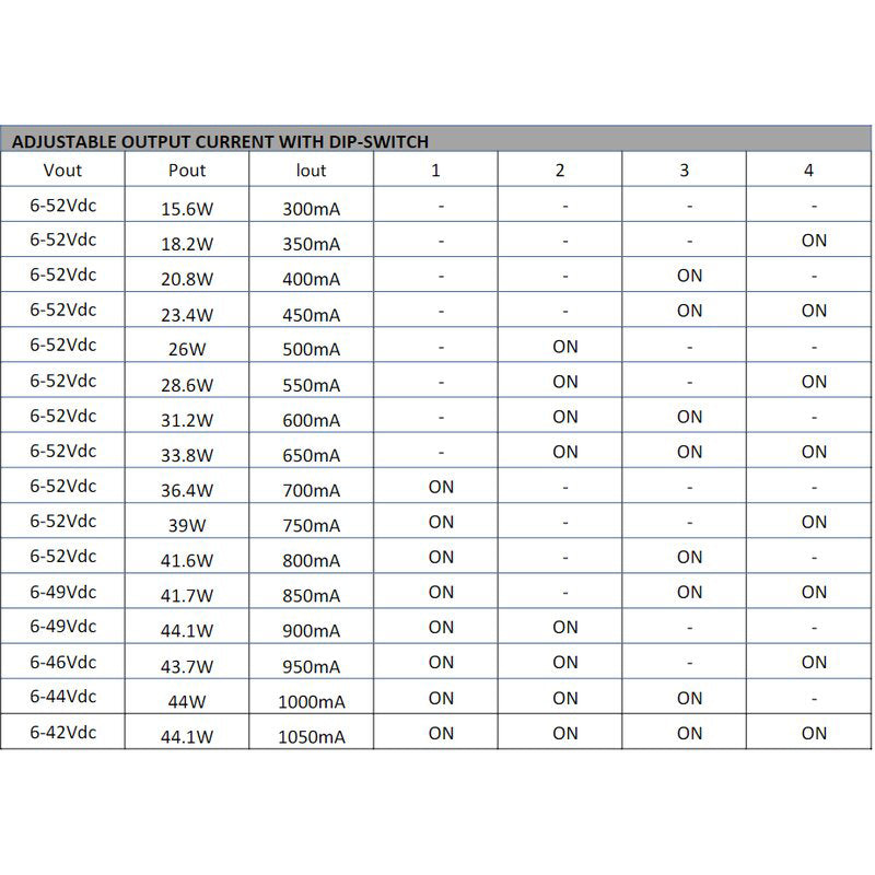 Das Netzteil ist dimmbar über DALI-2 Mit der Konstantstromtechnologie (CC) ist es für Leuchten mit konstantem Strom geeignet Die angeschlossenen Konstantstromleuchten können zwischen 1%-100% gedimmt werden Der Ausgangsstrom ist einstellbar: 300/350/400/450/500/550/600/650/700/750/800/850/900/950/1000/1050mA Das Netzteil ist standardmäßig auf 950mA eingestellt Geeignet für den Einsatz in Notbeleuchtungsanlagen