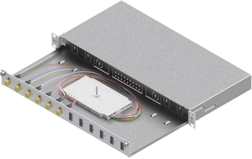 LWL-Spleißbox ausziehbar mit Schnellverschluss und bestückt mit Grade B Pigtails zum Spleißen von LWL-Kabeln.