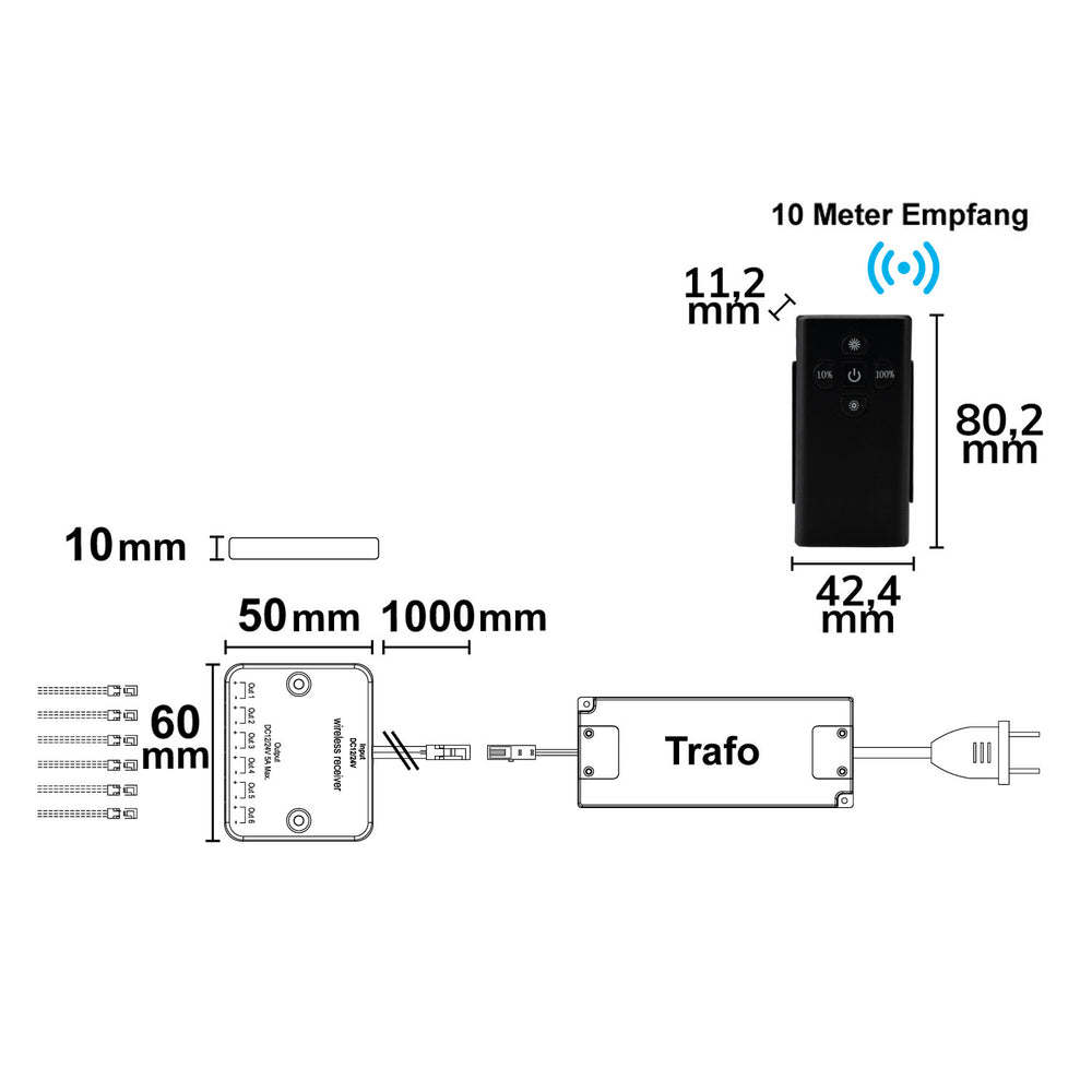 Empfänger mit 6-fach Verteiler (MiniAMP female-Buchse) und 1m Anschlusskabel, Aderquerschnitt 0,5mm² (MiniAMP male-Stecker), max. Distanz zwischen Fernbedienung und Empfänger: 10m, zuletzt gewählte Einstellung bleibt auch bei Trennung der Stromzufuhr erhalten, eine CR2032 3V Knopfzellenbatterie für die Fernbedienung wird mitgeliefert, Rückseite der Fernbedienung ist magnetisch, inkl. Wandhalterung
