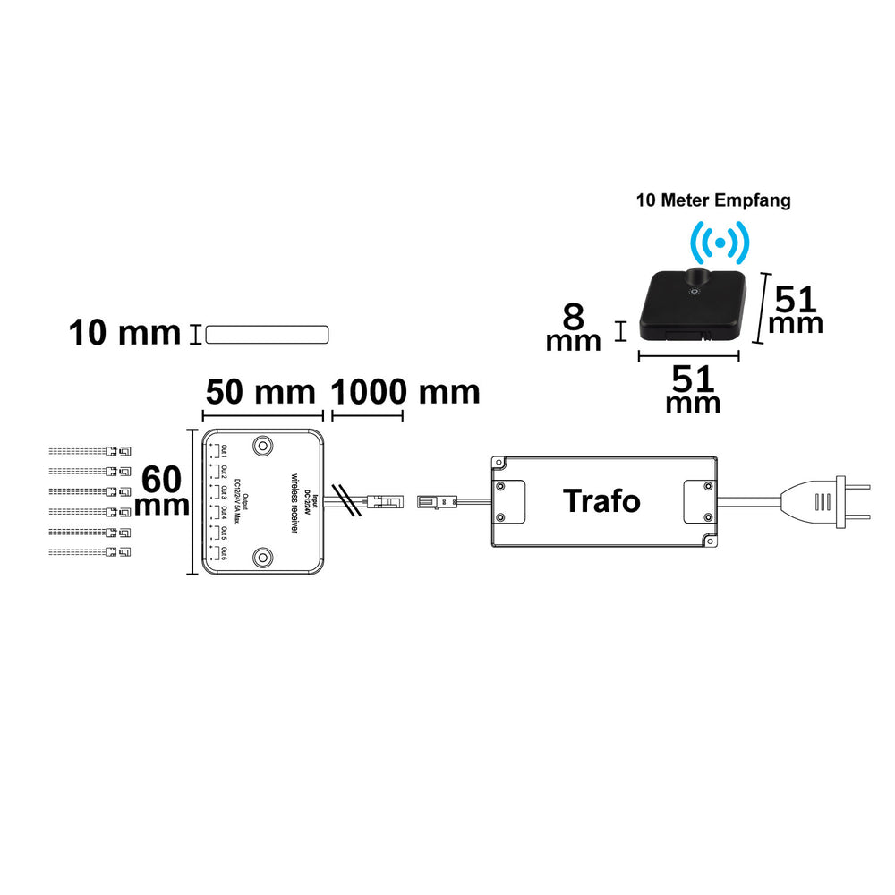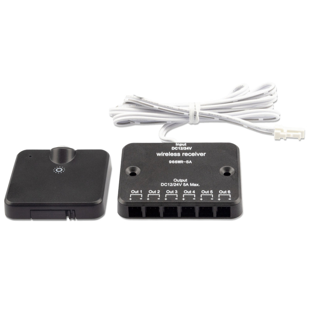Empfänger mit 6-fach Verteiler (MiniAMP female-Buchse) und 1m Anschlusskabel, Aderquerschnitt 0,5mm² (MiniAMP male-Stecker), max. Distanz zwischen Touch-Button und Empfänger: 10m, Bewegungs-Detektionsradius: 1-3m, schaltet 45 Sekunden nach der letzten Bewegung automatisch aus, eine CR2032 3V Knopfzellenbatterie für den Touch-Button mit PIR Sensor wird mitgeliefert, ein anschraubbarer Haltemagnet ist enthalten. Installation und Anschluss ausschließlich Spannungsfrei durchführen!