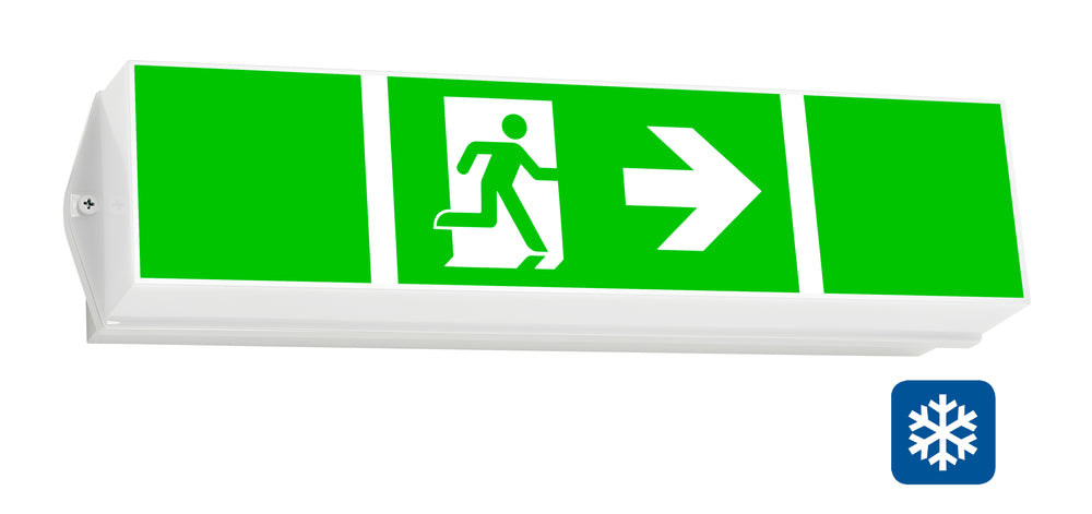 Mit 2x 3,2V/3,3Ah LiFePO4 Akkus geignet für Tieftemperaturen, -15°C bis +40°C, 1h/3h/8h einstellbar, Wandanbaumontage mit einseitigem Piktogramm, Erkennungsweite: 16m, IP65, IK06, Schutzklasse II, 1h: 300lm; 3h: 300lm; 8h: 120lm