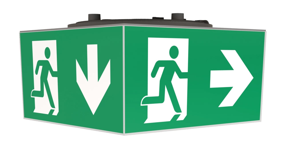 Deckenanbaumontage, optional: Seil- Ketten oder Pendelmontage, mit Bajonettverschluss, mit 4 x 1W High Power LED, IP65, WirelessControl Professional, 3h Autonomiezeit; Piktogramme mit Pfeilen: links, unten, rechts werkseitig angebracht, Erkennungsweite: 50m, per Funk schaltbar, LiFePO4 Akku, in WirelessControl Professional Ausführung
