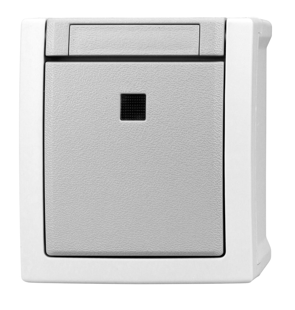 Robuster Aufputz-Taster aus langlebigem und witterungsbeständigem, glasfaserverstärktem Thermoplast-Kunststoff mit einem Orientierungslicht, welches dauerhaft leuchtet. Der Schalter ist IP54 Spritzwasser geschützt und bietet auch zusätzlichen Schutz gegen Staub. Weiters ist er gegenüber Chemikalien und erhöhten Temperaturen resistent und besitzt gleichzeitig eine hohe Schlagfestigkeit (IK05). Innerhalb des Schalters befindet sich für den Erdungsanschluss bereits eine angeschlossene Schnellanschlussklemme, welche ein noch einfacheres Anschließen ermöglicht. Es können bis zu drei Kabeln durch die Dichtungsmembran durchgeführt werden sowohl oberhalb, als auch unterhalb des Schalters.