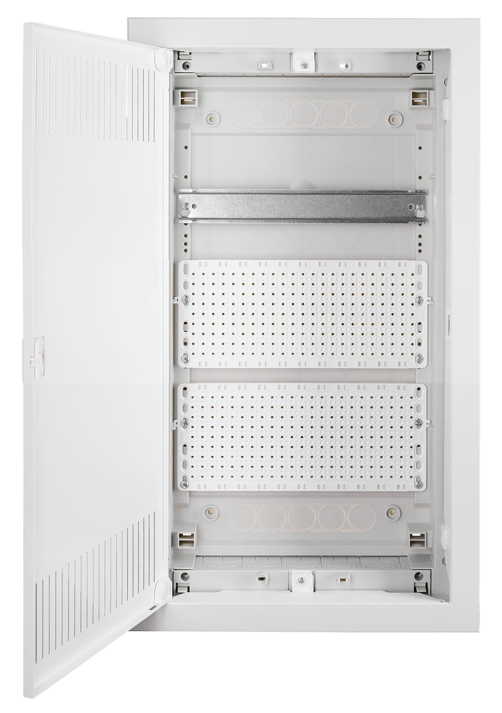 1x Hutschiene, 2x Kunststoffmontageplatten, IP30, RAL9003 (Signalweiß) inklusive Mauerwanne