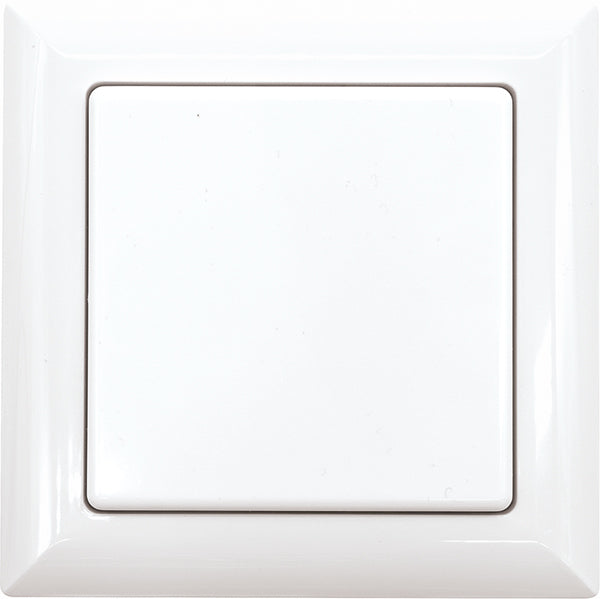 Funk-4-Kanal-Taster, 80x80mm außen, Rahmen-Innenmaß 55x55mm, 15mm hoch. Erzeugt die Energie für Funktelegramme selbst bei Tastendruck, daher ohne Anschlussleitung und kein Stand-by-Verlust.
