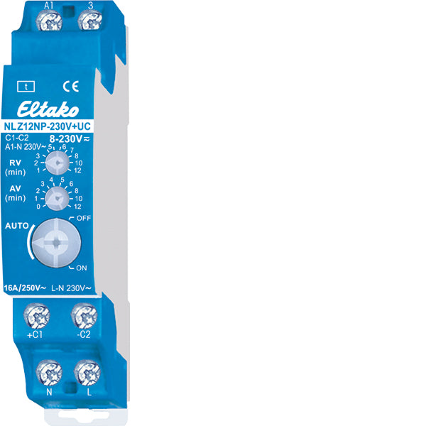 1 Schließer nicht potenzialfrei 16A/250V AC. Stand-by-Verlust nur 0,5 Watt. Reiheneinbaugerät für Montage auf Tragschiene DIN-EN 60715 TH35. 1 Teilungseinheit = 18mm breit, 58mm tief. Kontaktschaltung im Nulldurchgang zur Schonung der Kontakte und Verbraucher. Modernste Hybrid-Technik vereint die Vorteile verschleißfreier elektronischer Ansteuerung mit der hohen Leistung von Spezialrelais. Steuerspannung 230V und zusätzlich galvanisch getrennte Universal-Steuerspannung 8..230V UC. Versorgungs- und Schaltspannung 230V. Sehr geringes Schaltgeräusch. Nachlaufzeit 1 bis 12 Minuten mit dem oberen Drehschalter einstellbar. Ansprechverzögerung 0 bis 12 Minuten mit dem mittleren Drehschalter einstellbar. Dauer-Ein- und Dauer-Aus-Schalter mit dem unteren Drehschalter. Funktion: Mit dem Schließen des Steuerkontaktes (Lichtschalter) beginnt die Ansprechverzögerung AV (sofern nicht 0 eingestellt), an deren Ende der Ventilator zugeschaltet wird. Ab dem Öffnen des Steuerkontaktes und sofern eine eingestellte Ansprechverzögerung bereits abgelaufen war, läuft die eingestellte Rückfallverzögerung RV (Nachlaufzeit), an deren Ende der Ventilator abgeschaltet wird. Dieser Nachlaufschalter kann von allen Dimmern EUD12 und EUD61 selbst bei kleinster Dimmstellung angesteuert werden.
